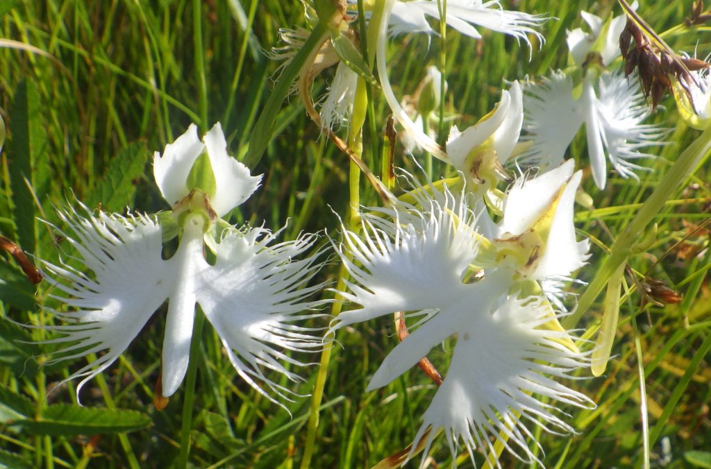 サギが空を舞っているように見える純白のサギソウの花が、三重県鈴鹿市地子町、西條町の境にある国天然記念物の湿地「金生水沼沢(かなしょうずしょうたく)植物群落」で咲き誇っている。手入れを続けて今夏、花を付けたのは1000株以上。猛暑の中、涼し気な風情だ。