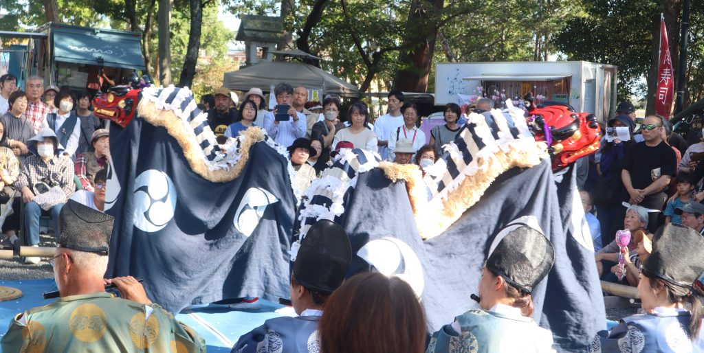 3流派は、椿大神社(つばきおおかみやしろ)の山本流、都波岐奈加等(つばきなかと)神社の中戸流、伊奈冨神社の稲生流。それぞれの流派の作法に従い、獅子頭1頭で舞ったり、2、4頭で動き回ったり。横笛や太鼓の音色に合わせて舞を披露した。秋晴れの下、大勢の見物客が詰めかけ、スマホで撮影するなどした。