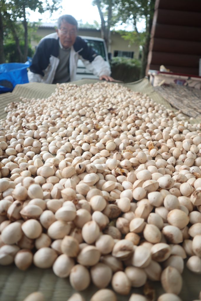 この白い実は? 三重県亀山市太森町のイチミ自然農園で天日干しされ、秋の味覚が食べ頃になっている。