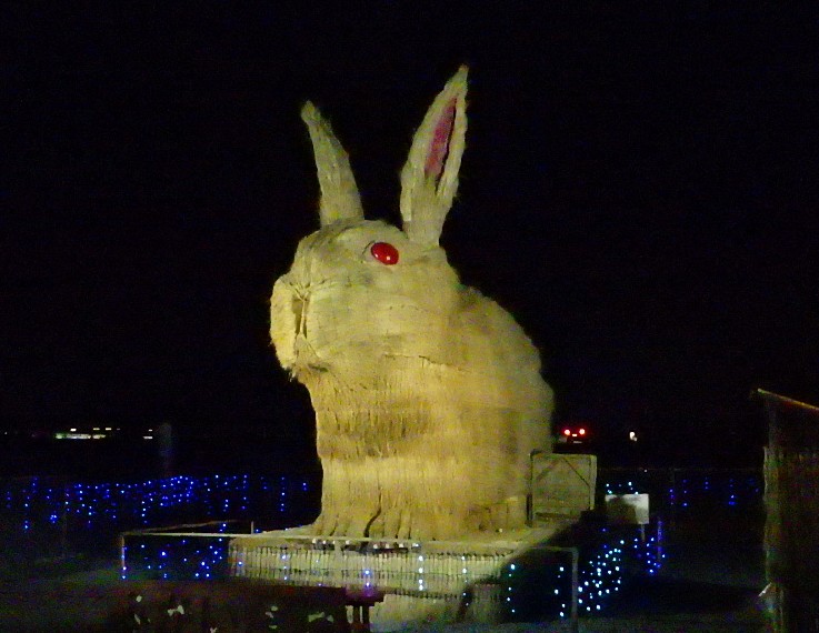 デザインは地域の子どもたちから募集して選んだ。共同の農作業場「深溝ライスセンター」に子どもから年配の人たちが集まって手作り。よく目立つよう目と長い耳は真っ赤にした。「顔のふくらみを表現するのに苦労した」と協議会の市川義行会長(74)。稲わらを材料にした作品づくりはペンギン、かさ地蔵、フクロウ、パンダに続き、ウサギで5年目に入った。毎年冬場にユニークな「稲わらアート」が屋外に展示され、県外からも見物客が訪れようになった。巨大作品の内部に入って、木材や竹の骨組みを見学することもでき、夜間はライトアップしている。