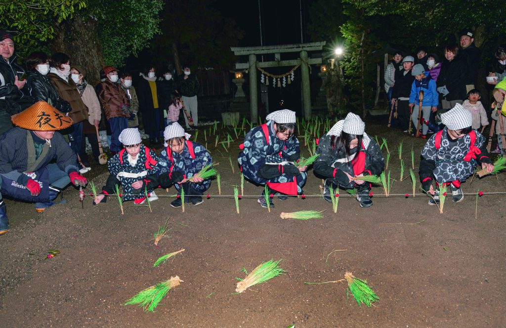 地元の女児5人が早乙女姿となって苗を手植えしたり、男衆たちがクワで耕す動作を披露したり。この地方では昭和時代の中頃まで行われていた昔の田植えのしぐさを演じた。神社は約1100年前の平安時代中期にまとめられた「延喜(えんぎ)式神名帳」にも記され、古い歴史を持つ。勝田真人宮司(79)によると、神社ができて以来、続く行事という。