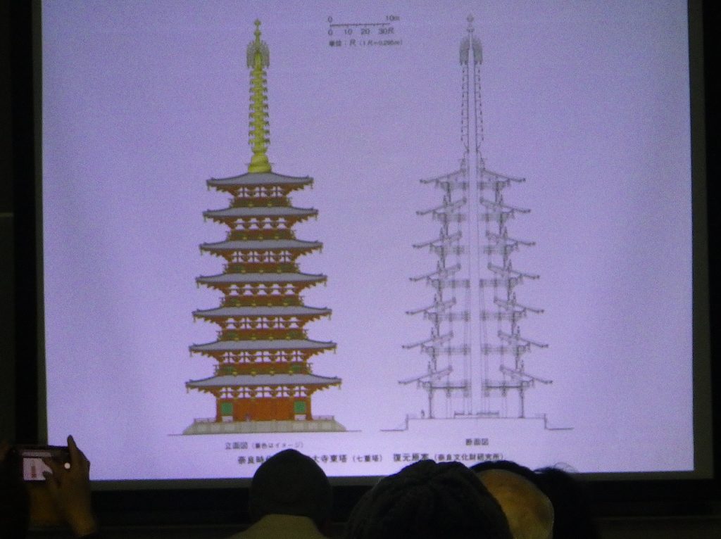 かつて東大寺(奈良市)に存在した七重の塔は、約30階建てのビルに相当する高さ100㍍近くという説や、約70㍍との説もあり、論争が続いてきた。奈良文化財研究所(奈文研)が史料を詳しく調べると、70㍍ほどだった可能性が高いことが判明。2月23日、三重県鈴鹿市国分町の市考古博物館で奈文研の研究者が最新の研究成果を披露し、100人近くが聞き入った。世界遺産の東大寺は、博物館に隣接する国史跡「伊勢国分寺跡」と深い関わりがあり、市が研究者を招いた。