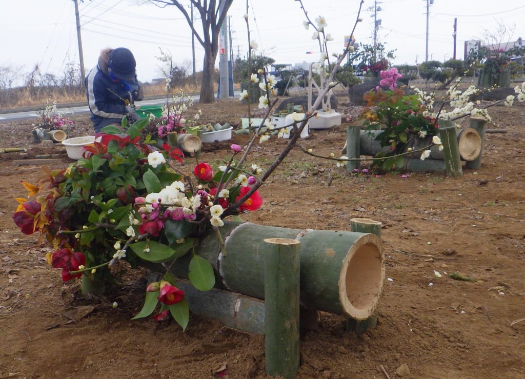 この空き地は、津市河芸町西千里との境にある県道沿いの公有地約200平方㍍。管理が十分に行き届いるとはいえず、雑草が茂っていた。団体のメンバーで農業岩崎泰生さん(86)らが4日がかりで手作りした。竹を切り出し、なたで割って大きな花瓶代わりにした。花の時期を迎えた紅白の梅の枝や、ヤブツバキ、赤く色づいたオタフクナンテンは、岩崎さんの近くの自宅や畑、知人らから調達。空き地に計15個の「生け花」が並んでいる。「きれいですね」と声をかけていく人もおり、岩崎さんは「喜んでもらえて励みになる」と話している。(酒井直樹)