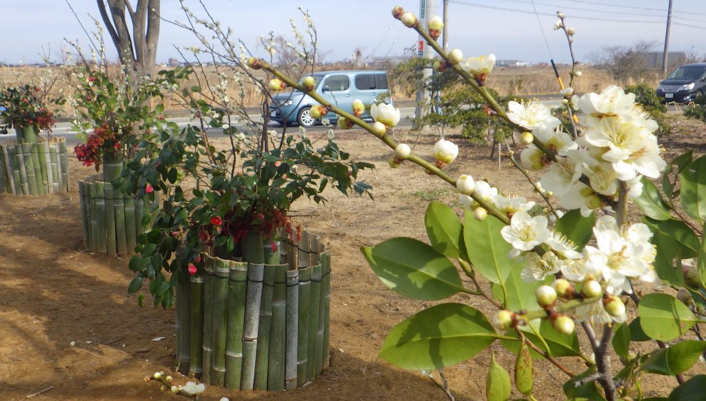 三重県鈴鹿市秋永町と津市境にある空き地に、地元の奉仕団体「見るにみかねて」が梅やツバキを飾り、生け花風に仕立てている。3月8日には、ほぼ完成し、近所の人が散策がてらに訪れ、春の風情を楽しんだ。