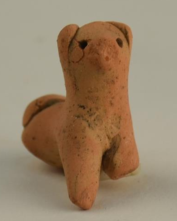 三重県鈴鹿市飯野寺家町と西條町境にある戦国時代の「沢城跡」で、市が昨年5~11月に実施した発掘調査で、かわいい犬の土製品が出土した。しっぽを巻いて耳が垂れ、子犬みたいな体つきをしている。高さ3・5㌢の小さな置き物風。土師器(はじき)のように低温で焼いたとみられる。さて、この犬の用途は。