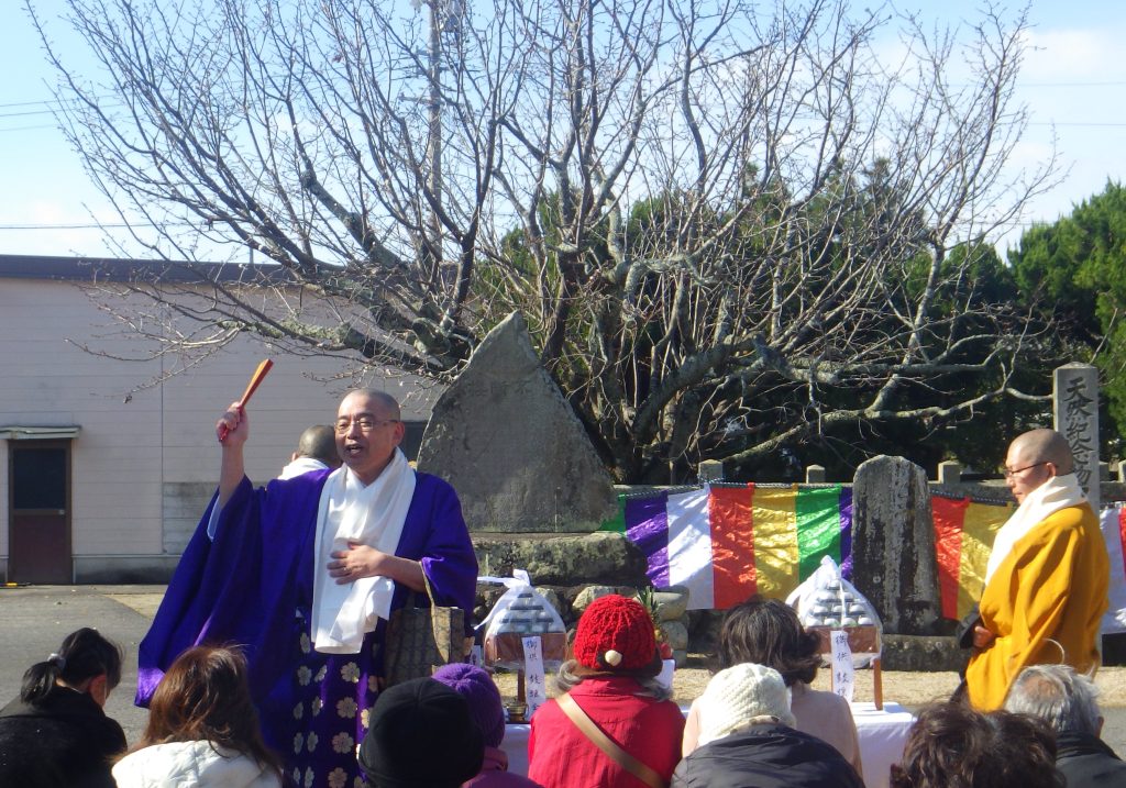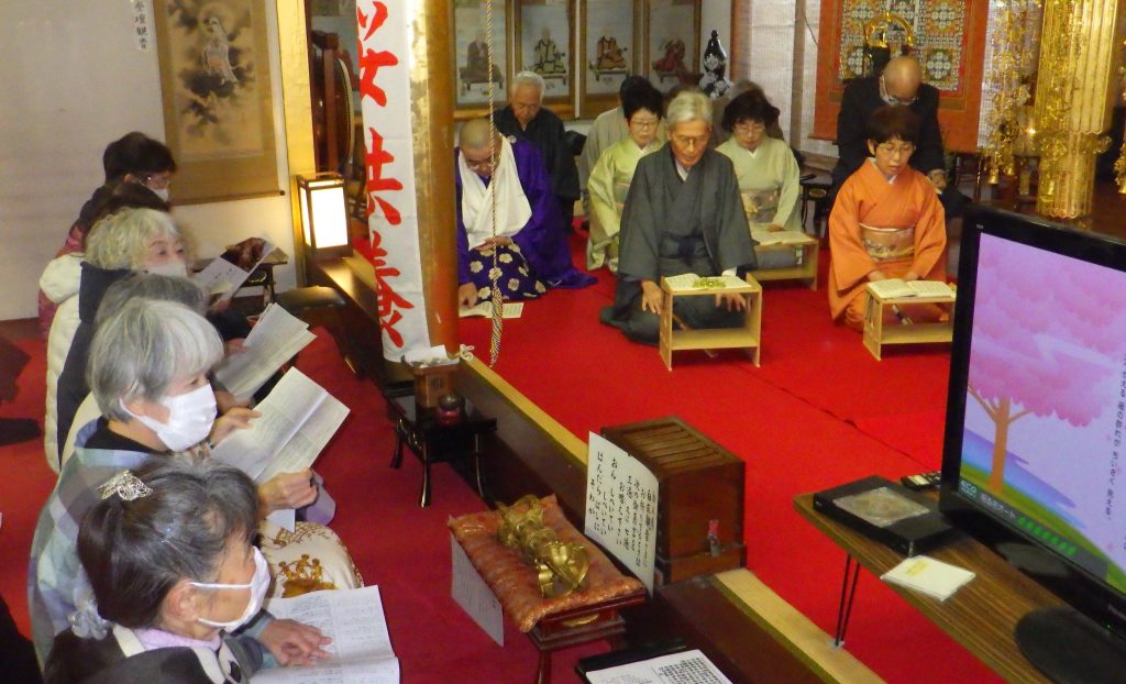 本堂では、地元の愛好家団体「鼓謡会」の9人が江戸前期の謡曲「不断桜」を披露した。能を演じる時、独特の節回しでストーリーを語る謡曲。「不断桜」は、天皇の命で白子不断ザクラを見るため、寺を訪れた使いが、漁師に化けた桜の精と語り合う物語。奈良時代の聖武天皇の時代に創建されたことや、寺が火災に遭い、焼け跡から桜が芽生えたことを昔の言葉で披露した。寺は江戸時代、伊勢神宮に参拝する旅人が行き交った伊勢街道沿いにあり、秋から冬にかけ盛んに咲く桜が不思議がられて「伊勢参宮名所図絵」など、多くの史料に名所として登場する。