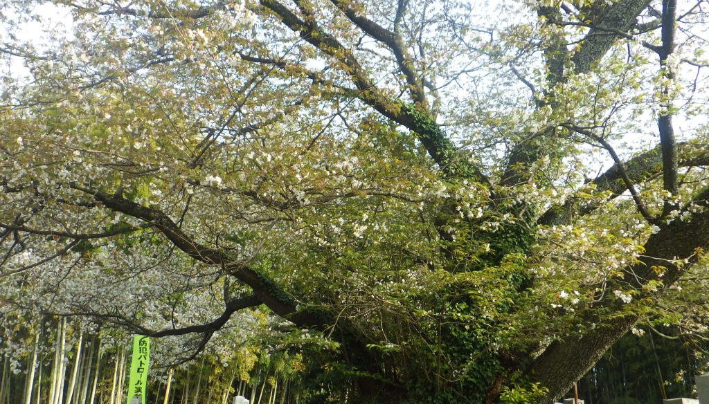 奈良時代の天平12(740)年、聖武(しょうむ)天皇が突然、伊勢の国に赴き、三重県鈴鹿市国分町を訪れた時、植えたとの言い伝えが残り、地元では「王城(おうじょう)桜」と呼ばれている。墓地に生え、根元が直径6㍍余りの古木。ヤマザクラの一種らしく、4月初めには、若葉と同時に小ぶりの花をいっぱい付けた。