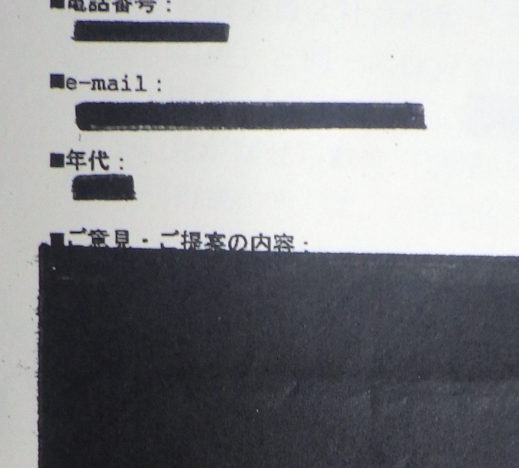 【情報公開で鈴鹿市が開示した公文書。黒塗りされ、いわゆる「のり弁」状態になっている】
