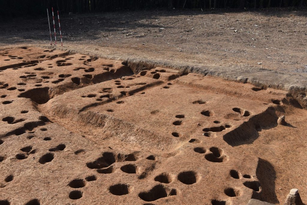 これまで土の焼け跡が残るかまどや、生活道具の土器などが発見されたが、集落に併設される墓は出土していなかった。今年1月まで行った発掘調査で、10棟以上の住居跡のほか、「方形周溝墓」2基が初めて出土した。浅い堀を巡らした一辺が約5㍍の正方形をしており、当時、多く造られた一般的な墓の形状。2025年度も隣接する場所を調査する予定で、担当者は集落の墓域が見つかる可能性があるとみている。