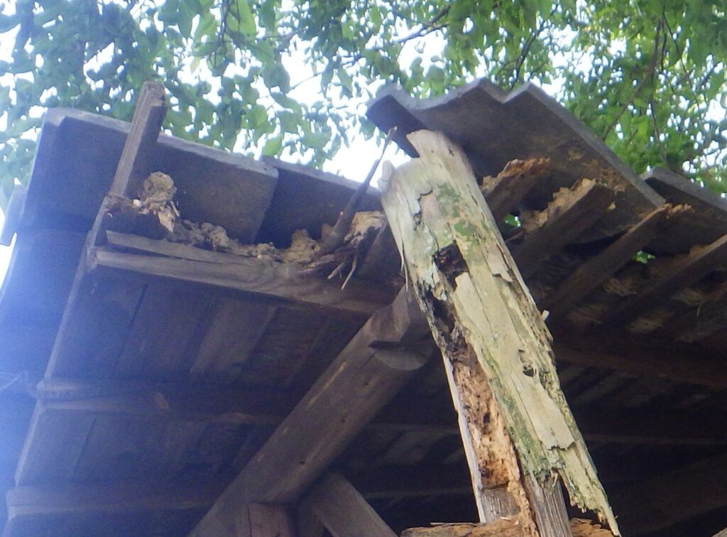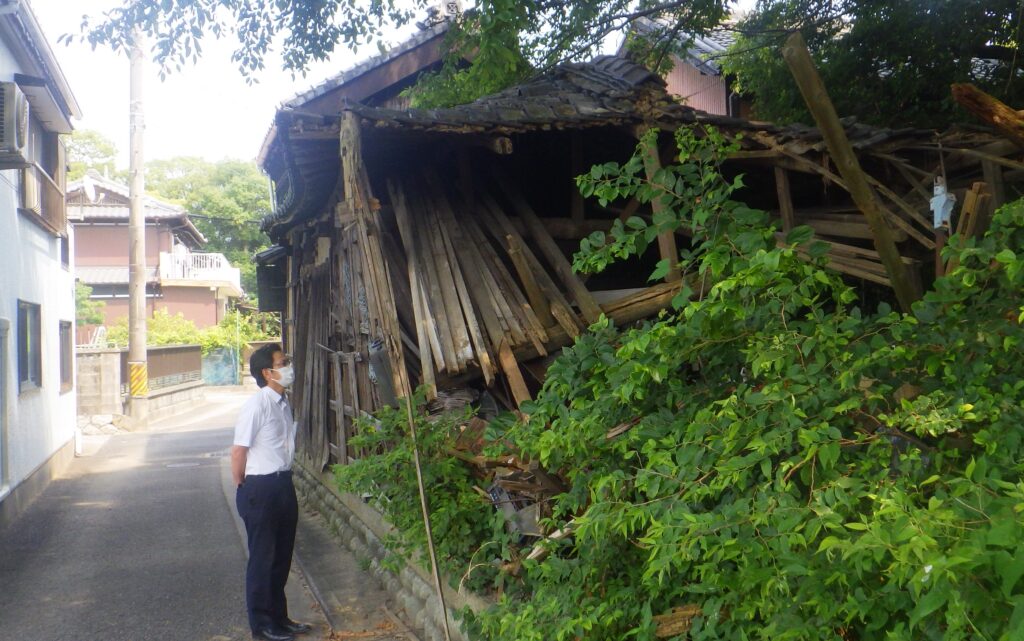 この空き家は伊勢湾に面した古くからの住宅密集地にあり、600平方㍍余りの敷地に木造の母屋や蔵、鶏舎などが建っている。地元関係者らによると、住人が亡くなり、4年ほど前から空き家になっている。樹木や雑草が生い茂り、害虫の発生源になったり、異臭がしたりして改善を求める声が上がっているという。長方形の敷地の北、南、西側が、生活道路の市道に面しており、付近には屋根から落ちたとみられる瓦の破片なども散乱し、屋根が朽ちて落下の恐れがある瓦も目立つ。