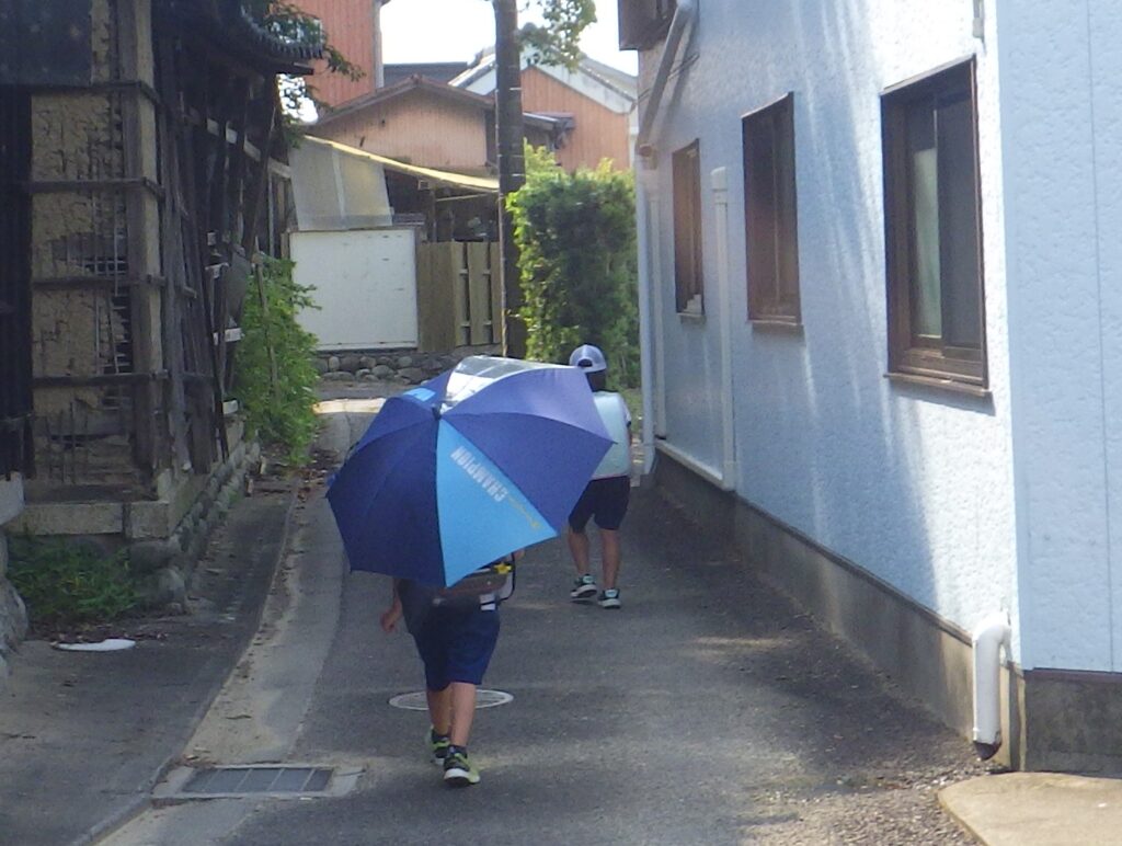 倒壊しそうな空き家㊧沿いを通り、通学する小学生=7月1日、鈴鹿市長太旭町で