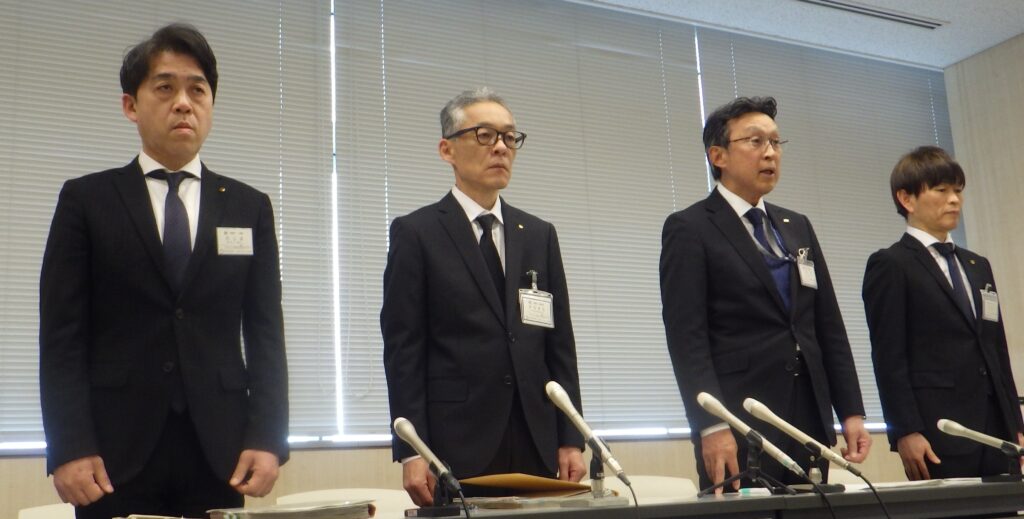 【2件の懲戒免職で頭を下げる樋口幸人副市長(右から2人目)ら=鈴鹿市役所で】